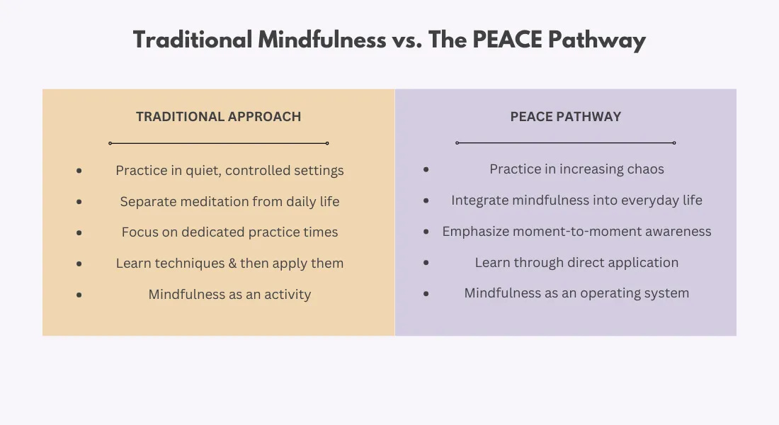 In the image below, Derek outlines the differences between Traditional Mindfulness vs. The Peace Pathway.